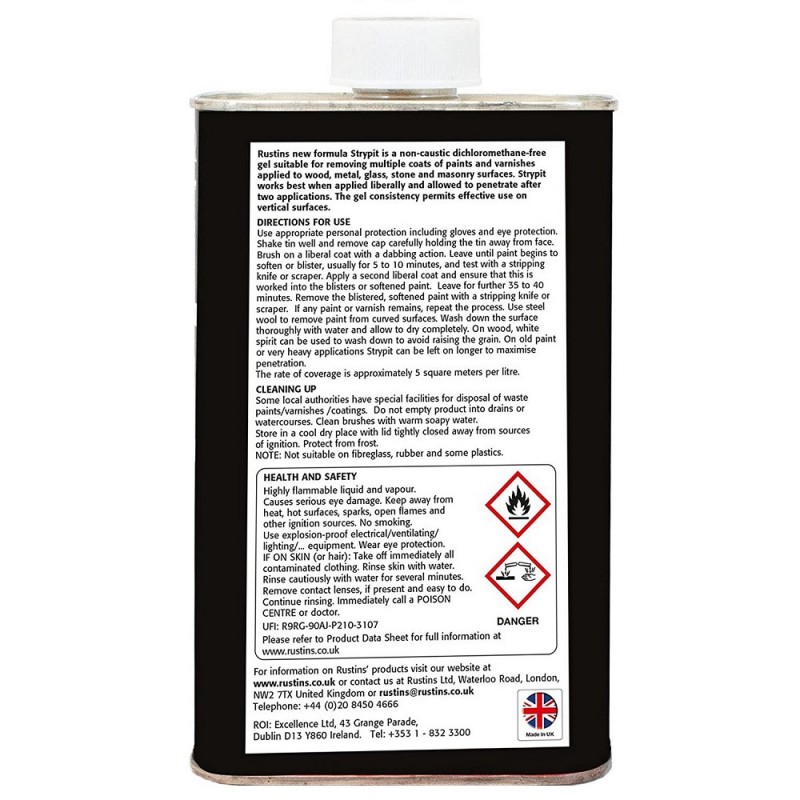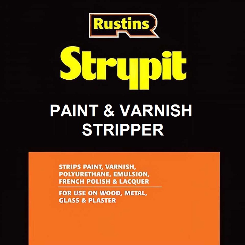 Rustins new Strypit formula a non caustic dichloromethane free gel thats suitable for removing multiple coats of paint, varnish, cellulose, polyurethane, emulsion, French Polish, lacquer and textured finishes from wood, metal, glass or plaster.